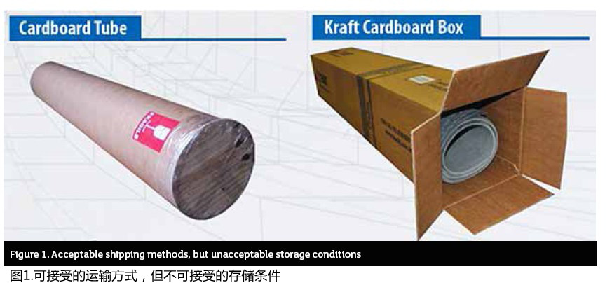 請(qǐng)注意,特別是對(duì)于彈性體粘合纖維片材,盡管盒子和紙管是經(jīng)批準(zhǔn)的以卷材形式運(yùn)輸片材的方法,但它們不應(yīng)在任何情況下用作長(zhǎng)期存放(參見(jiàn)圖1)。