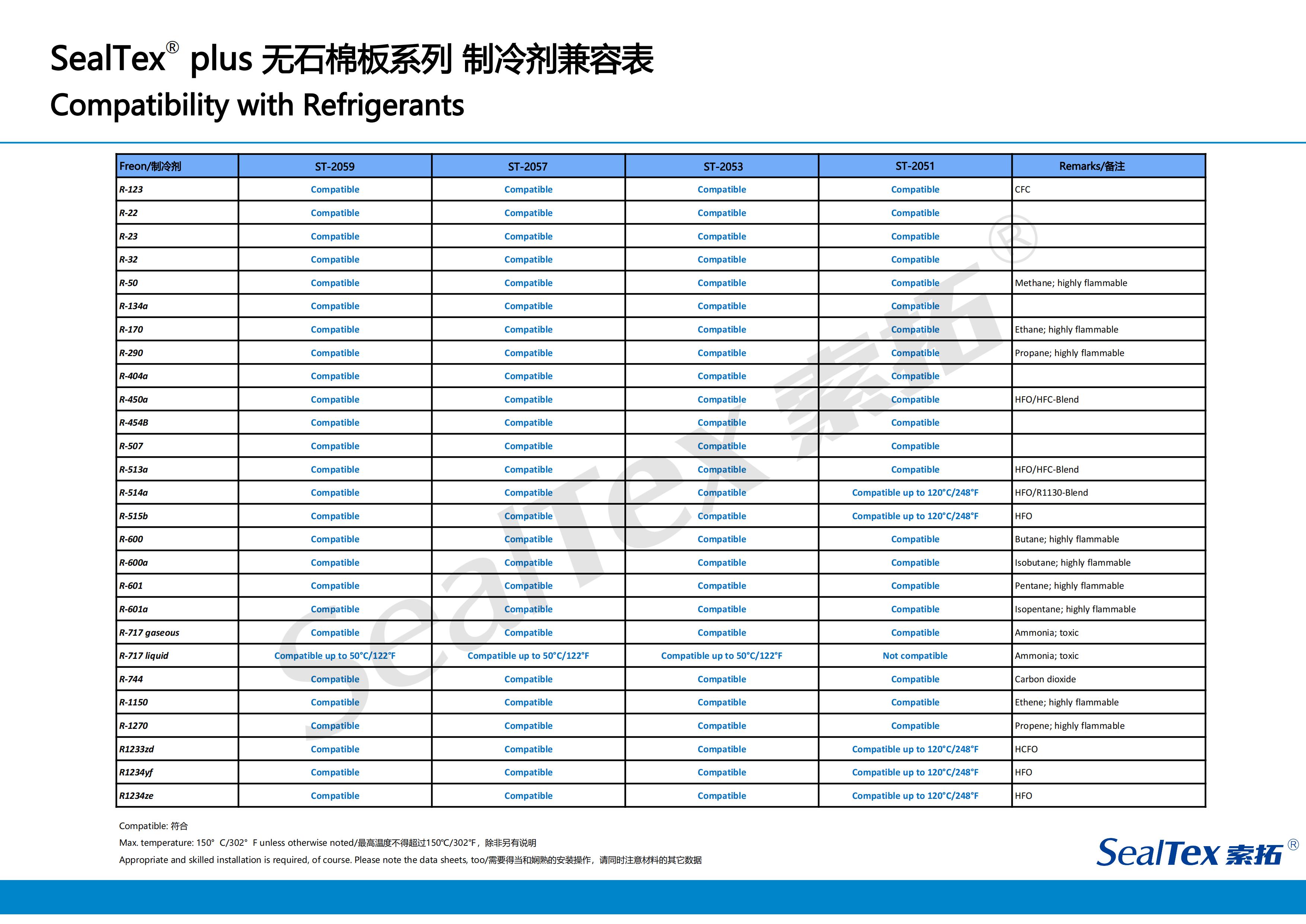 對于密封式和半密封式制冷壓縮機(jī)來說,每類制冷壓縮機(jī)可能會用到不同的制冷劑,一個(gè)能完全遏止制冷劑的可靠性密封系統(tǒng)是決定壓縮機(jī)長期穩(wěn)定運(yùn)轉(zhuǎn)的重要因素。SealTex索拓公司為滿足制冷壓縮機(jī)用戶的要求,特別推出能在各種法蘭壓力下保持卓越密封性能的無石棉密封材料以滿足市場的需求。這些產(chǎn)品非常適用于半密封式壓縮機(jī)、冷卻裝置,對螺桿式和往復(fù)式壓縮機(jī)的應(yīng)用尤其適合。例如:ST-2059、ST-2057、ST-2053、ST-2051.